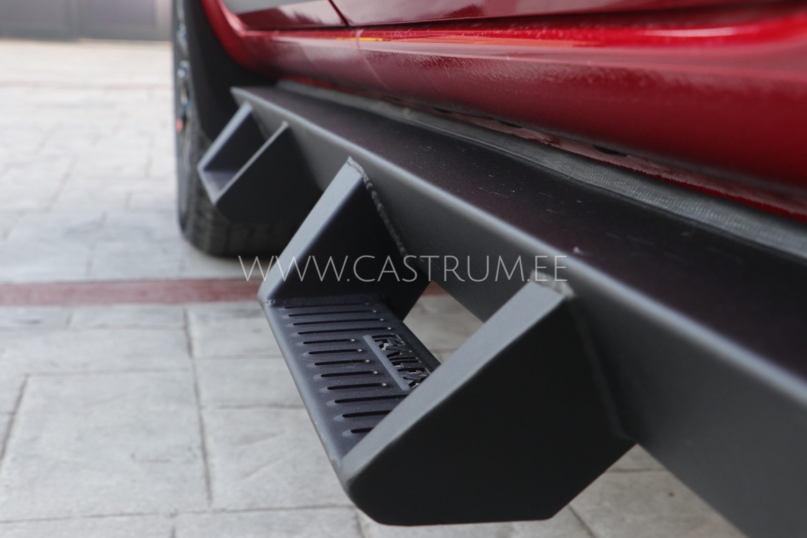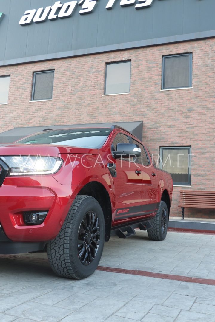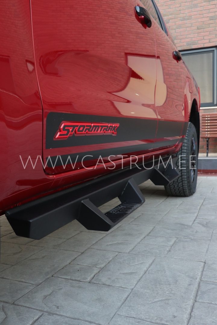 Matt-musta viimistlusega robustsed küljerauad, millel on nii esi- kui ka tagaistmetele ligipääsu lihtsustamiseks astmed.