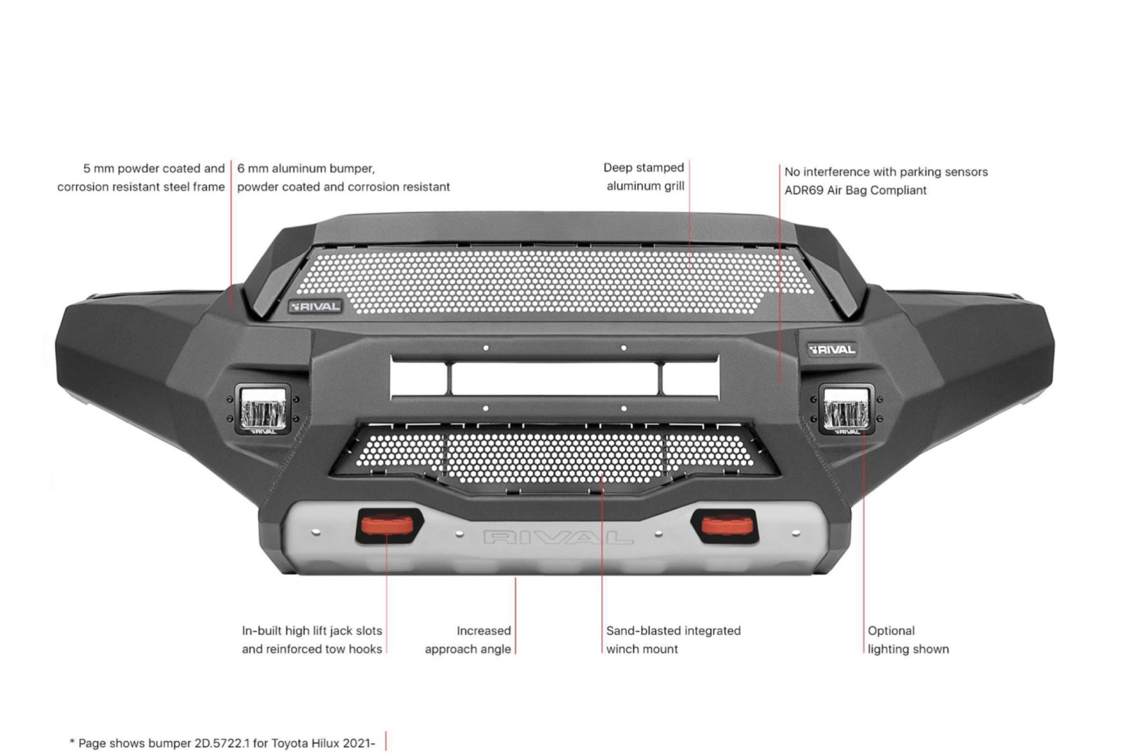 RIVAL-alumiinipuskurit ovat yhteensopivia useimpien 3 tuuman lisäsumu-/ajovalojen kanssa. Useimmissa puskureissamme on vakiona integroidut vinssin kiinnityspisteet.