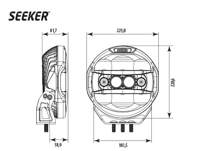 Kuvaus: SEEKER® Quantum Ledzer – hybridivalo 8 tehokkaalla LEDillä ja kahdella LAZER-valonlähteellä. 8 x Luminus LEDi + 2 x SLD LAZER, Ref. 50, 12000/6500lm, 6000K, 1lux @ 850m, virrankulutus: 6.97A @ 13.7V, R112, R7, R10, johto 220cm, 3-napainen DT-liitin, paino 2.8kg