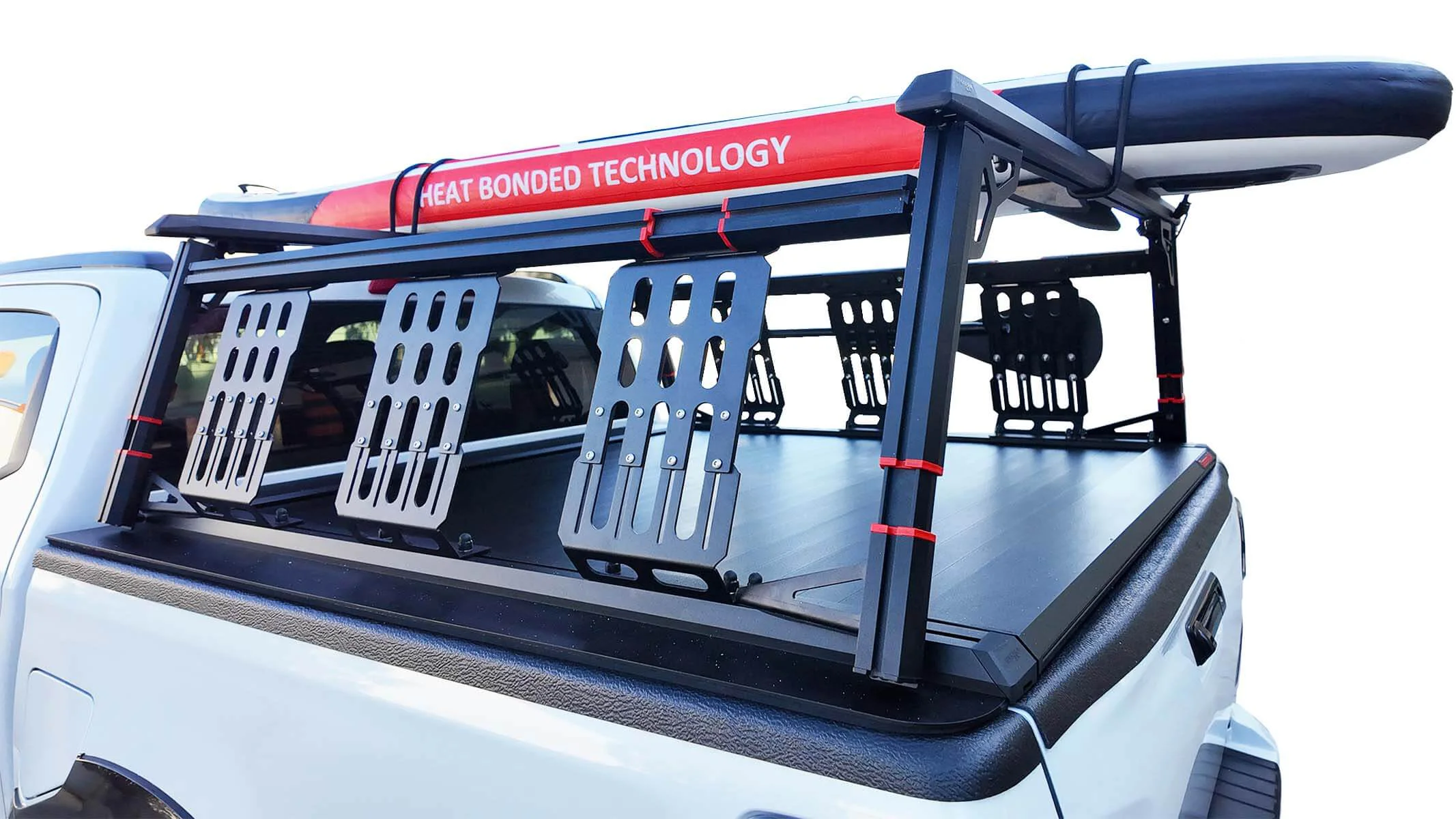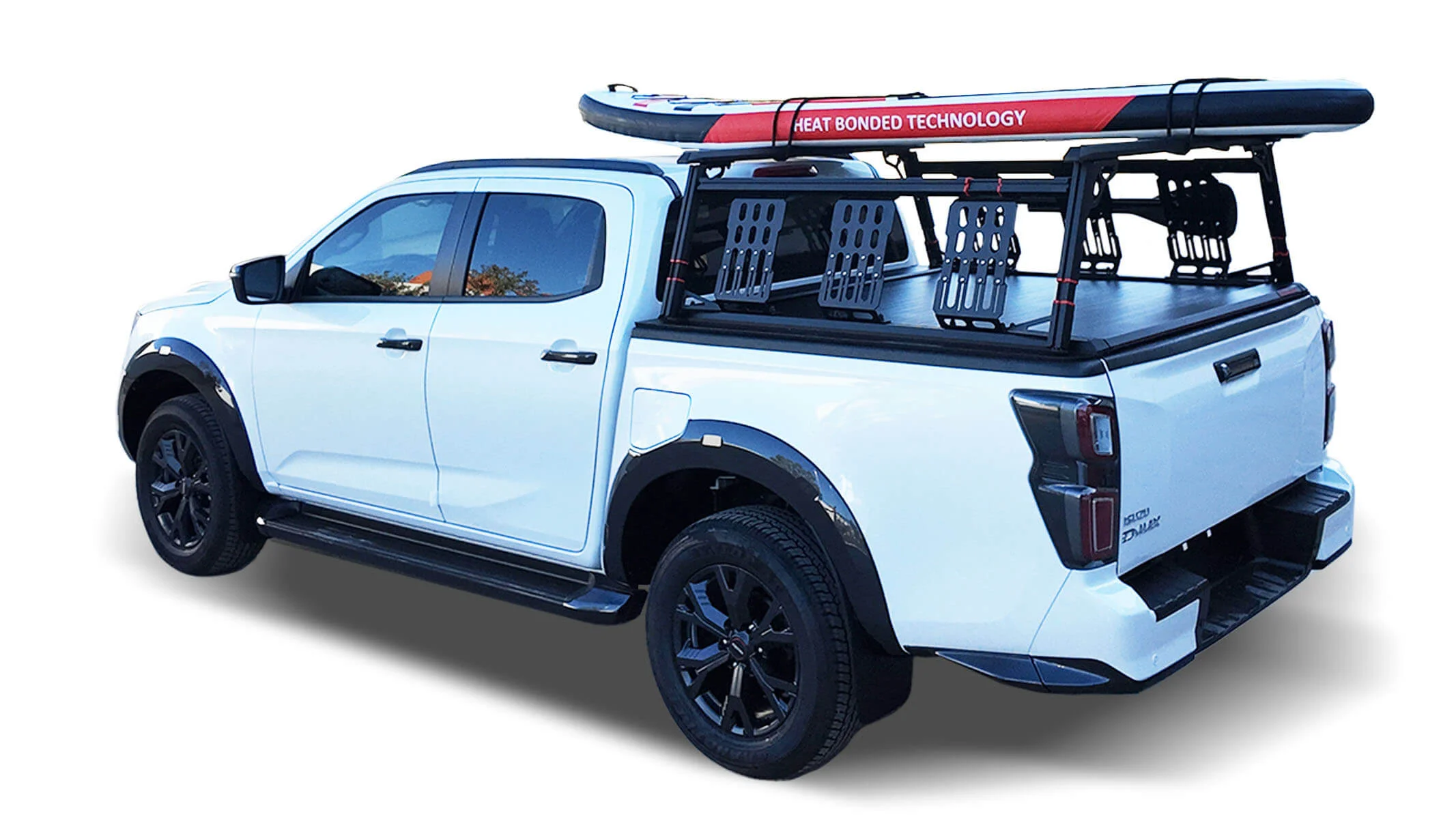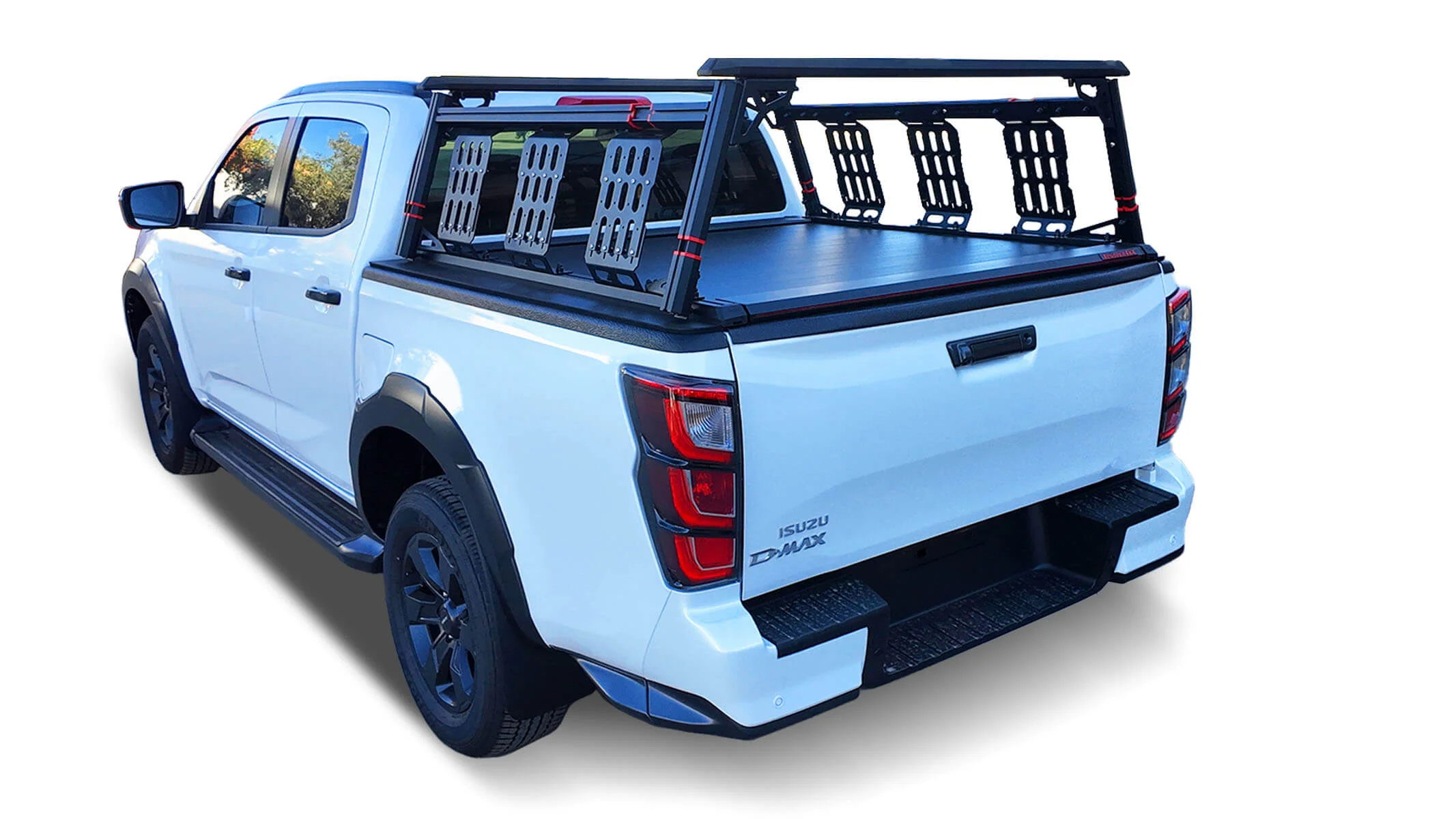 - Erityisesti suunnitellut alumiiniset sivukiskot (5 mm paksuiset), integroidulla “T-SLOTS”-järjestelmällä, joka mahdollistaa lisävarusteiden, kuten rollbarien, sivukahvojen ja poikittaispalkkien, helpon ja turvallisen asennuksen ilman porausta.