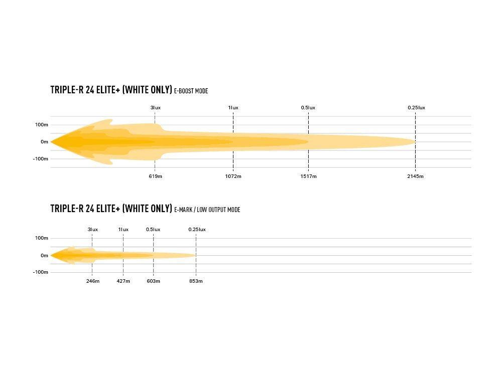 White light ECE approved to Reg 149 (Class B, Driving Light) for on-road use (E-Boost technology), and Reg 148 position/side light function (white only).
